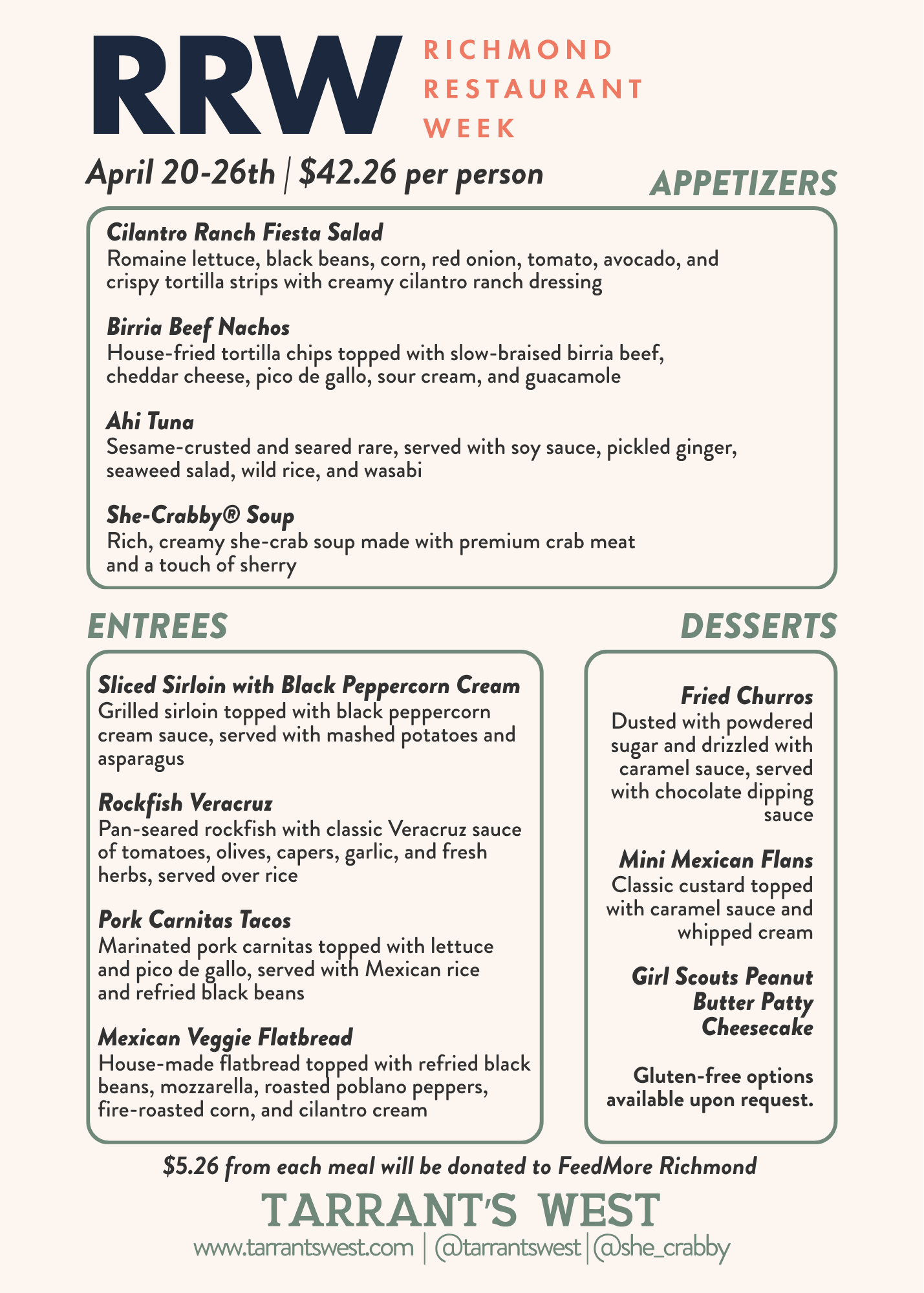 Celebrate Richmond Restaurant Week with us! For a limited time, enjoy a specially curated menu featuring guest favorites and seasonal dishes—including our signature She-Crabby® Soup. Each meal not only delivers a memorable dining experience, but also gives back—$5.26 from every Restaurant Week meal will be donated to Feed More to help fight hunger in our community. Join us for great food, great company, and a great cause.